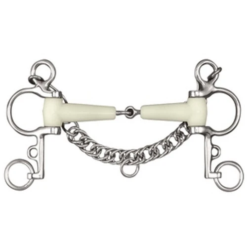 Happy Mouth Jointed Pelham. Made using an apple-scented, space-age polymer, Happy Mouth bits encourage horses to accept the bit, providing for a gentler bit and a happier horse. The polymer is applied over stainless steel for durability. The bit includes a curb chain. Sizes: 5″, 5.5″, 5.75″.