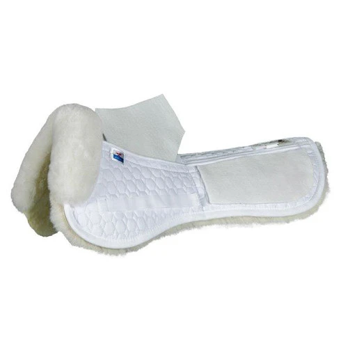 Pockets in the front and rear of the pad allow you to add shims as needed for incremental changes. Many horses have asymmetries or change shape over time. The resilient Poly-Flex shims are 5mm thick and can be layered and trimmed. This pad includes 12 shims (6 front and 6 back) for you to create a custom fit. Great pad for using on multiple horses! Mattes GOLD AP Shim Half Pad should be laundered when needed with Melp Liquid Detergent and line dried to maintain the beneficial properties of the natural fleece and sheepskin and reduce shrinkage.