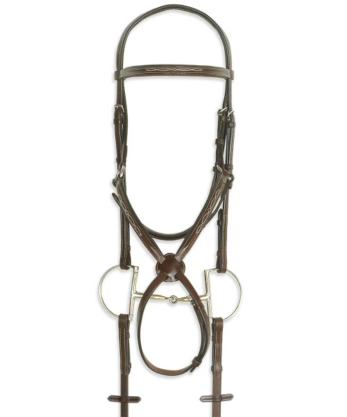 Pessoa PRO Fancy Stitched Figure-8 Bridle with Comfort Crown features a padded 5/8 inch noseband and padded 5/8 inch browband. The low key proportions make it a very nice snaffle bridle for any horse, even those with a refined head. Horse show competitors will appreciate the traditional good looks. Pessoa PRO Fancy Stitched Raised Figure-8 Bridle comes with standard length 54 inch BioGrip Rubber reins. Available in Full size in Dark Brown.